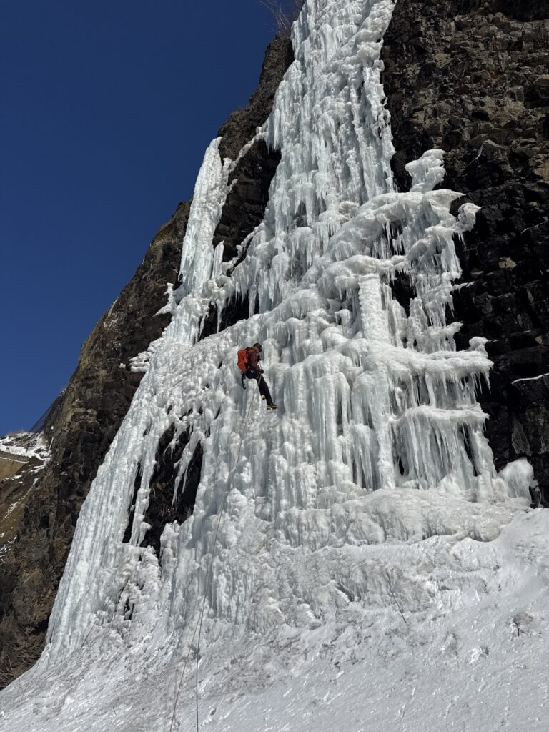 雪の中に半分潜った巨大な龍のような湿雪雪崩が通っていき、、
